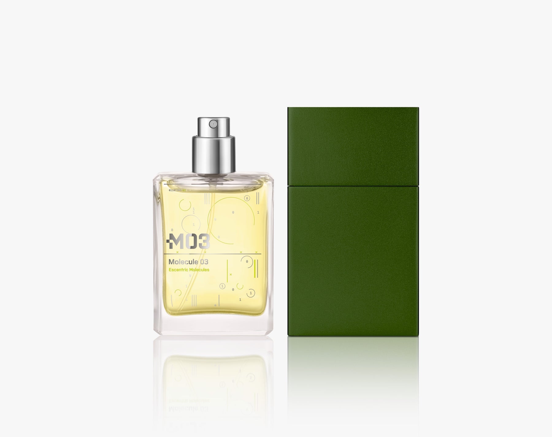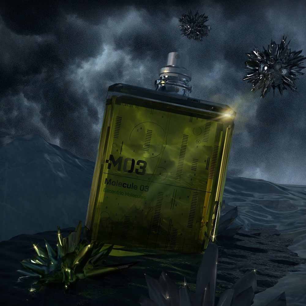 Molecule 03 è costituita da Vetiveryl Acetato, puro e singolare. Il Vetiveryl Acetato potrebbe essere descritto come una molecola ibrida, seminaturale, semisintetica. È una frazione di olio di vetiver, distillato dalle radici di un'erba indiana, che viene poi 'incrociato' con acido acetico per eliminare gli aspetti amari e coriacei della radice.